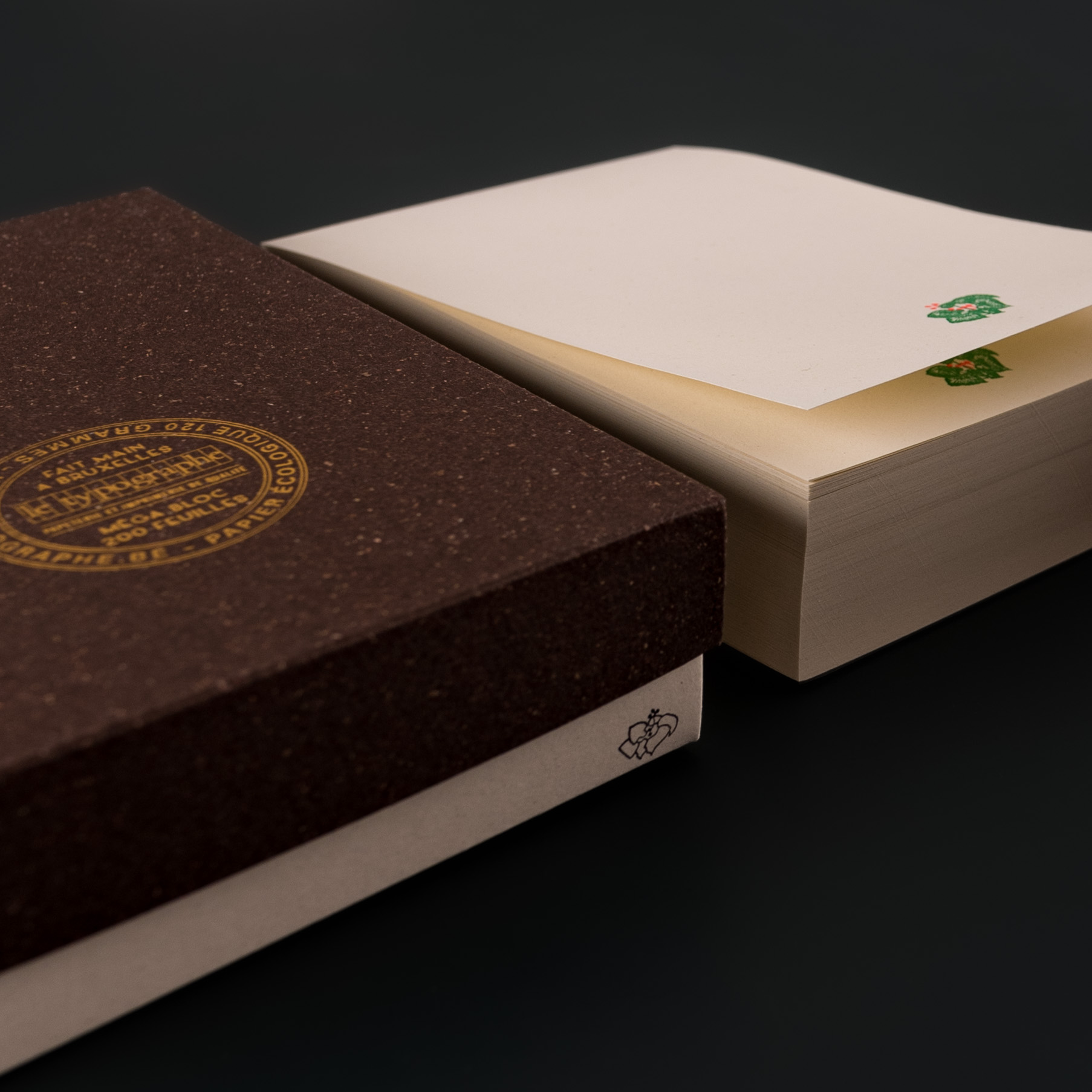 Mega Note Pad B6200 light-coloured sheetsEcological 120g paper with vegetable inclusions, made from 40% recycled fibres and 15% organic residues - produced with renewable green energyFormat 11.8 x 17 cm (between A6 and A5)Gold glueREUSABLE BOX - the base is made from paper matching the pad and the lid from dark brown paper with vegetable inclusions-Letterpress printed motif on each sheetThe pads are entirely handmade in Brussels-For anyone who likes to always have a notepad to hand.The B6 mega pad is a real eye-catcher for your office, living room or kitchen. It'll follow you around the house.With 200 sheets, it's sure to last.Its ready-to-give packaging makes it a perfect gift and protects it from knocks.