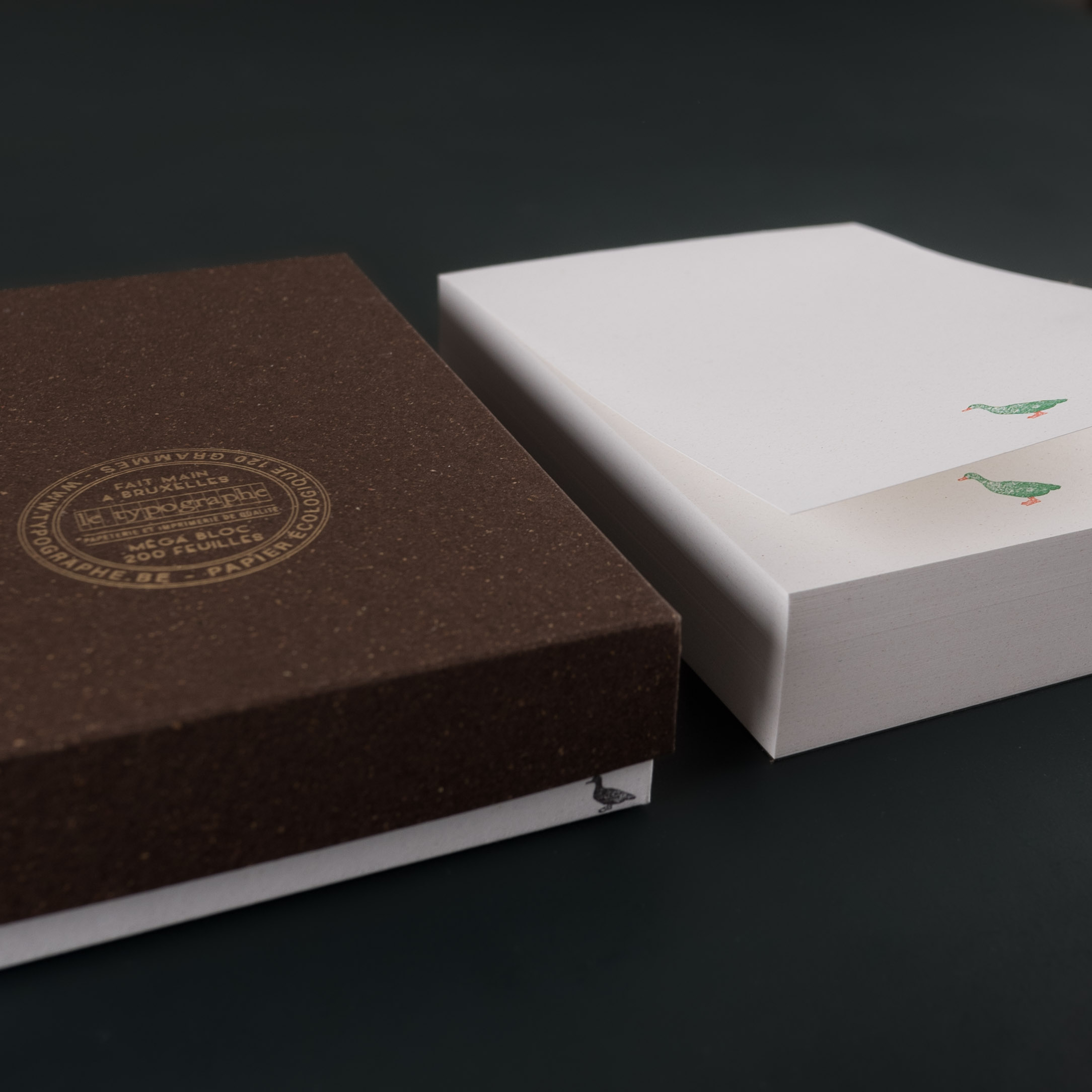 Mega Note Pad B6200 light-coloured sheetsEcological 120g paper with vegetable inclusions, made from 40% recycled fibres and 15% organic residues - produced with renewable green energyFormat 11.8 x 17 cm (between A6 and A5)Gold glueREUSABLE BOX - the base is made from paper matching the pad and the lid from dark brown paper with vegetable inclusions-Letterpress printed motif on each sheetThe pads are entirely handmade in Brussels-For anyone who likes to always have a notepad to hand.The B6 mega pad is a real eye-catcher for your office, living room or kitchen. It'll follow you around the house.With 200 sheets, it's sure to last.Its ready-to-give packaging makes it a perfect gift and protects it from knocks.