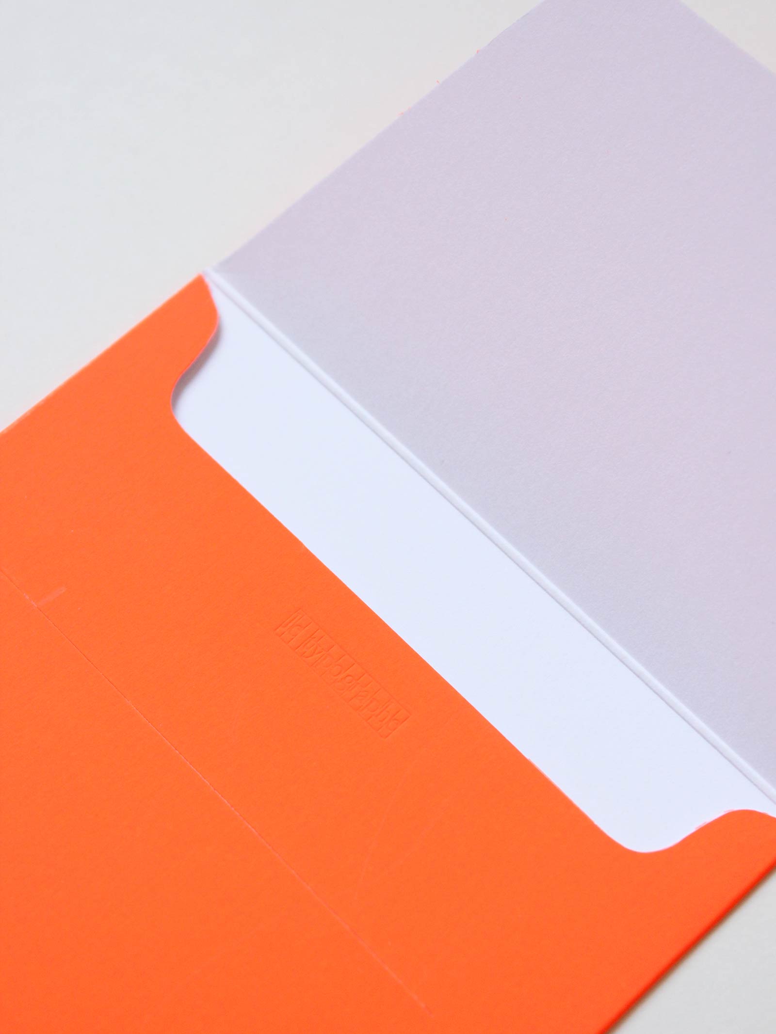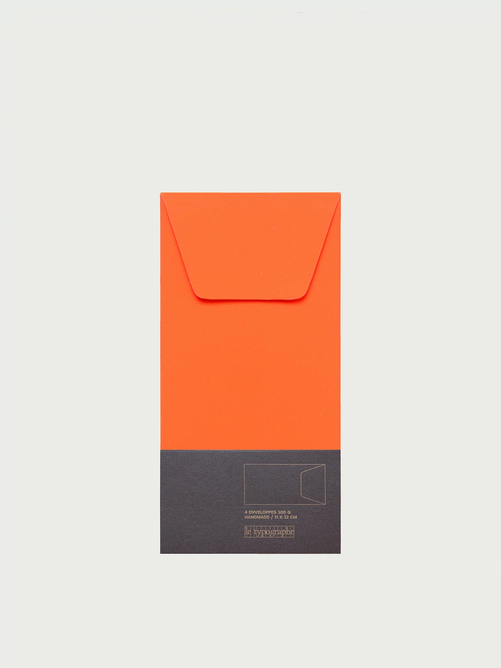 NEW PRODUCTS, Pack of Cards and Envelopes, DL cards + 300g envelopes (11x22 cm)Pack of 4 DL envelopesEach envelope is letterpress printed with a check pattern on the outside Fluorescent orange interior Extended format - 11 x 22 cm Opening on short side 300g paper - Hand-glued in Brussels A perfect envelope to accompany a pretty postcard, correspondence card or letter.11,80 € - limited product