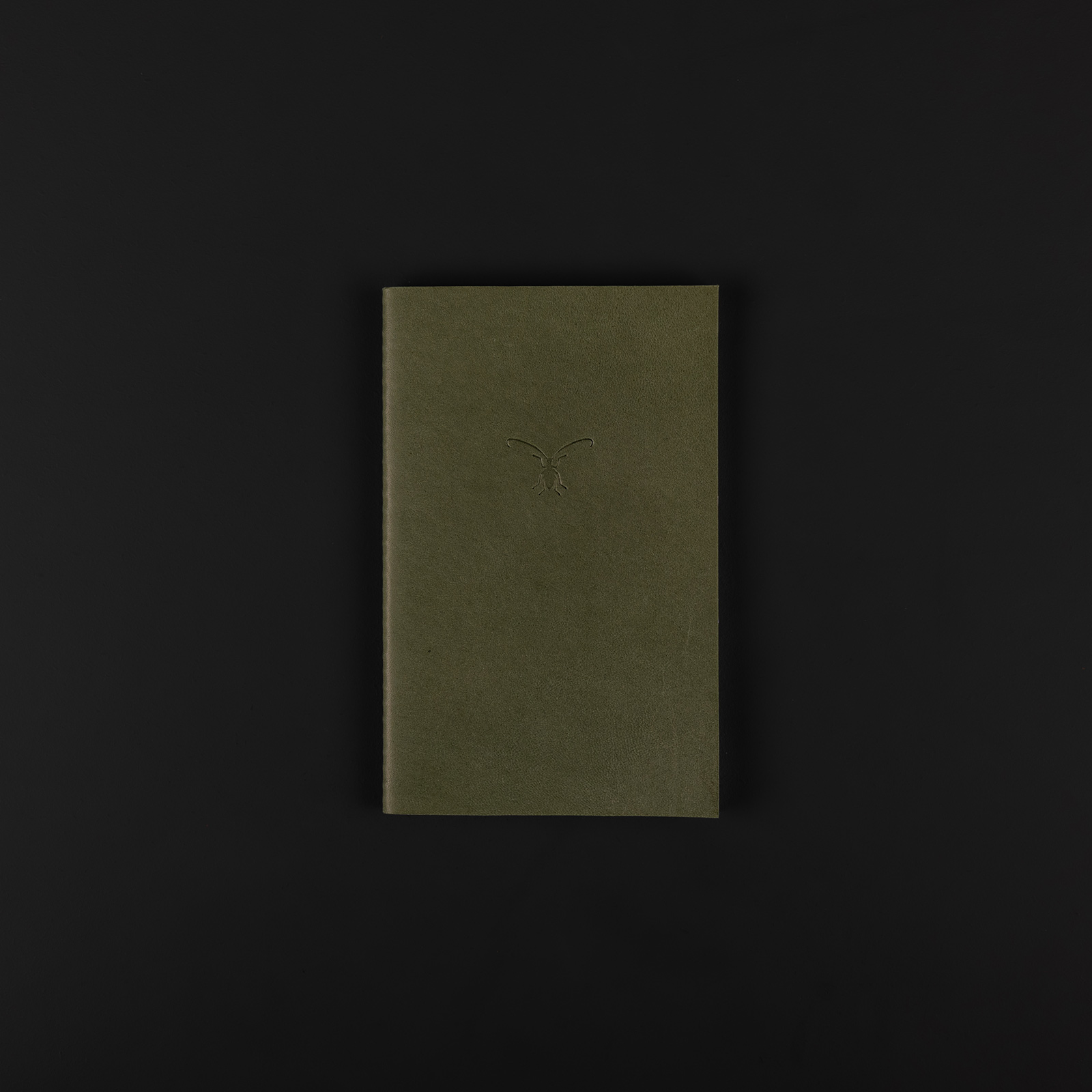 sa couverture en cuir se patinera avec le temps selon votre utilisation et l’impression à sec avec un insecte longicorne, à grandes antennes, en fait un carnet unique