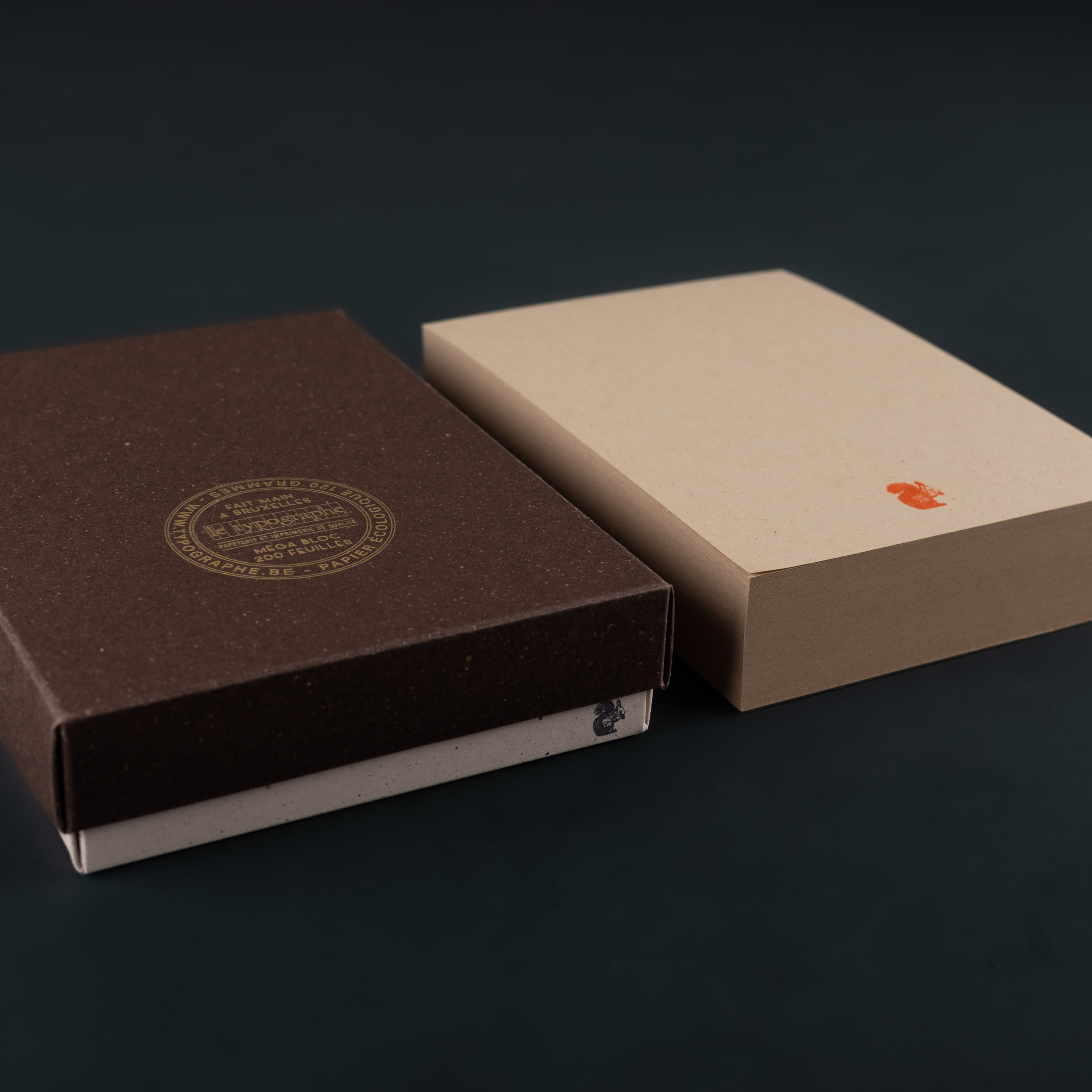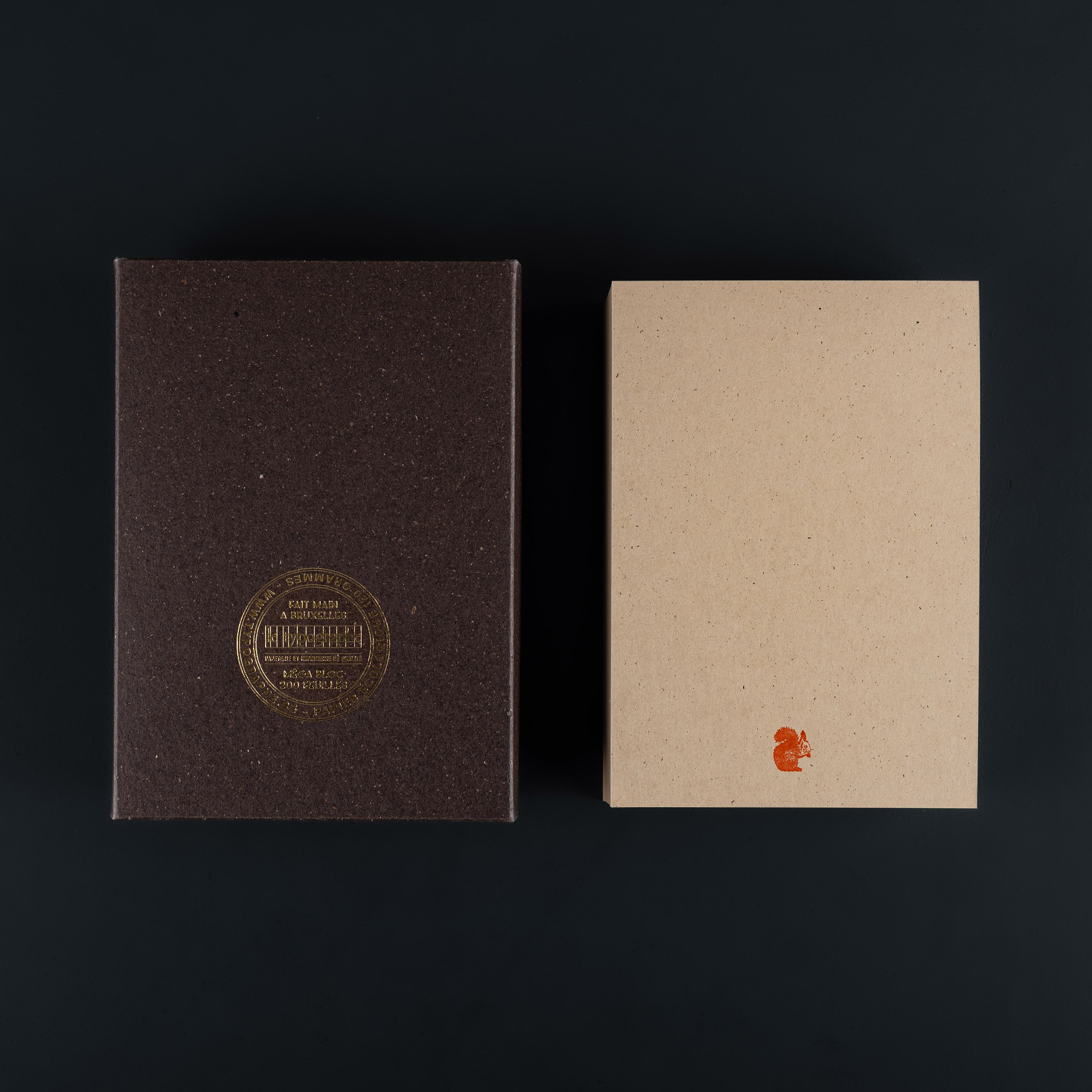 BOITE REUTILISABLE – le fond est fait dans un papier assorti au bloc et le couvercle avec un papier brun foncé à inclusions végétales également